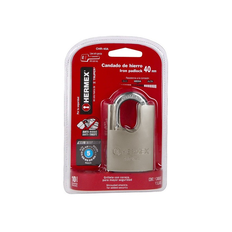 Candado Acorazado de Hierro 40mm Seguridad 5, cierre doble balin 3 llaves anti-ganzua, CHR-40A 43312 Hermex