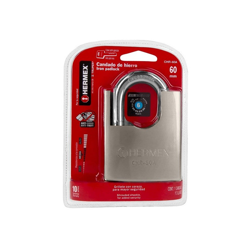 Candado Acorazado de Hierro 60mm Seguridad 6, cierre doble balin 3 llaves anti-ganzua, CHR-60A 43314 Hermex