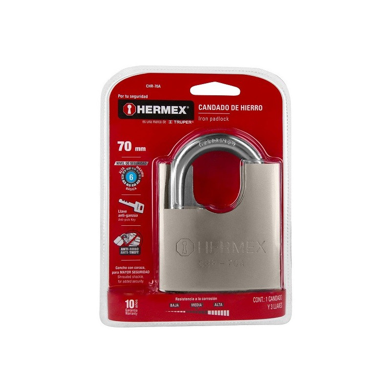 Candado Acorazado de Hierro 70mm Seguridad 6, cierre doble balin 3 llaves anti-ganzua, CHR-70A 43003 Hermex