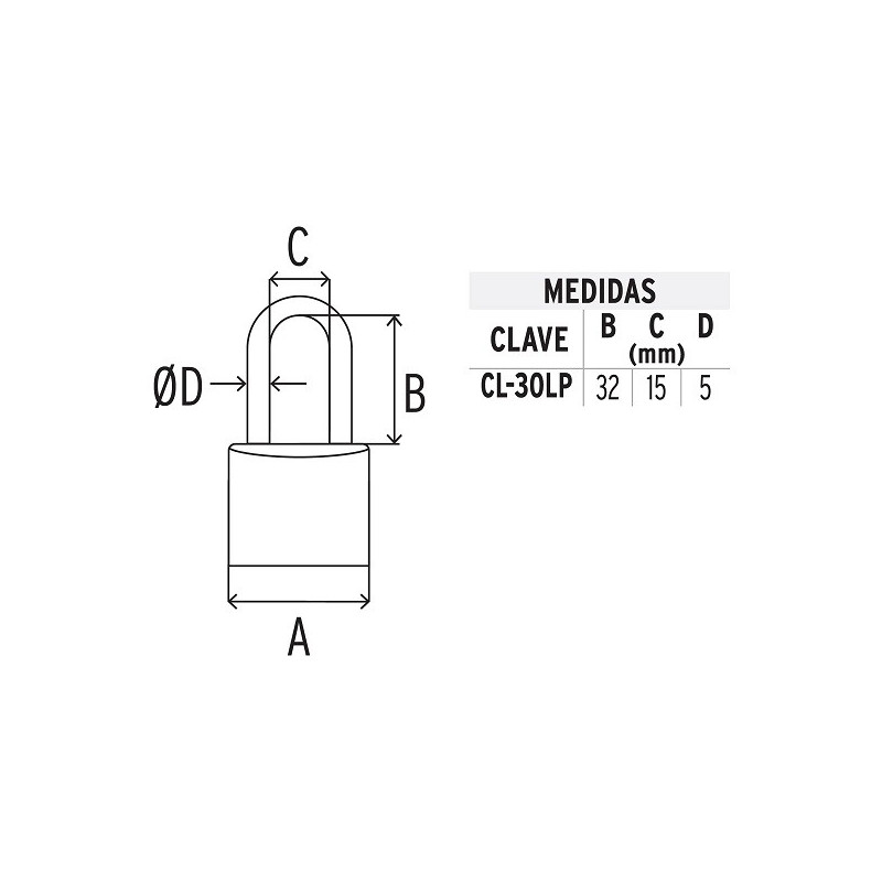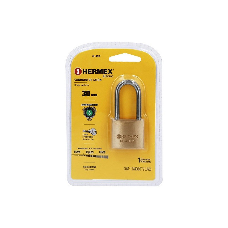 Candado Pulido Basico arco largo 30mm Seguridad 3, Incluyen 2 llaves Tradicional, CL-30LP 23516 Hermex