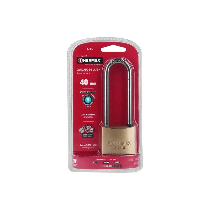 Candado Pulido de Alta seguridad extra largo 40mm Seguridad 5, Incluyen 2 llaves Tradicional, CL-40XL 43441 Hermex