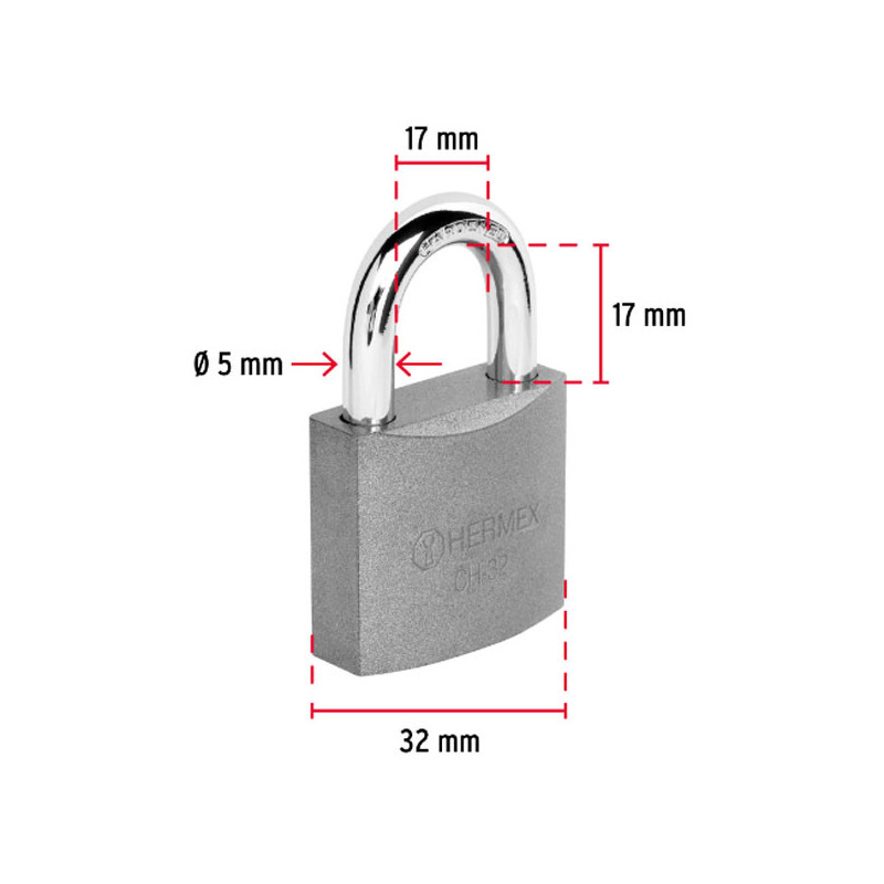 Candados 38mm S3 Hierro Hermex 43315 Cuerpo de hierro en una sola pieza y gancho corto reforzado de acero con acabado cromado Seguro tipo perno, seguridad estándar Cilindro de latón sólido con 5  pernos que brinda resistencia a robos Mecanismo interno resistente a la corrosión
