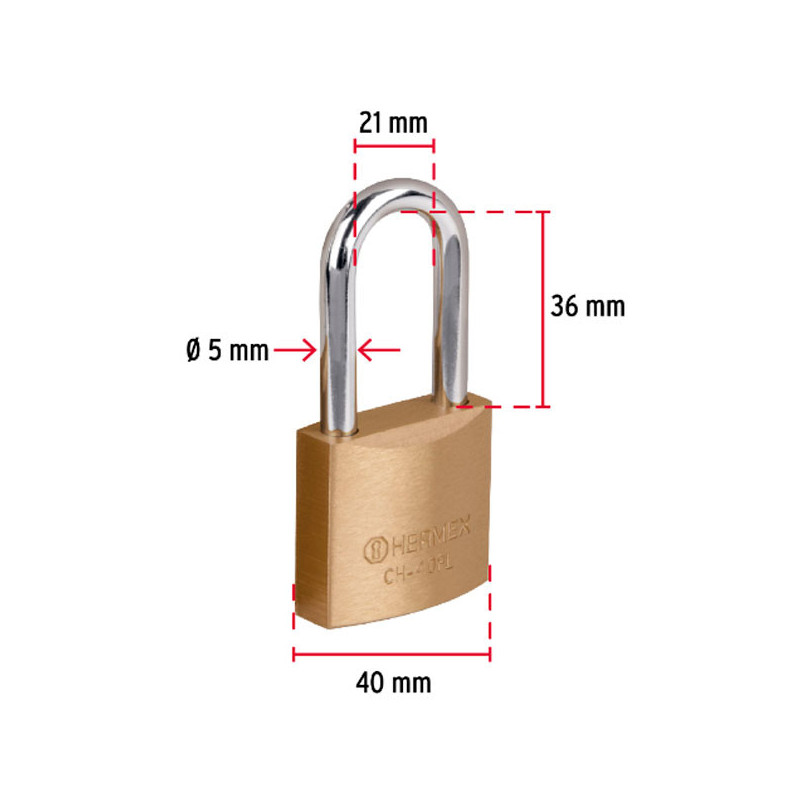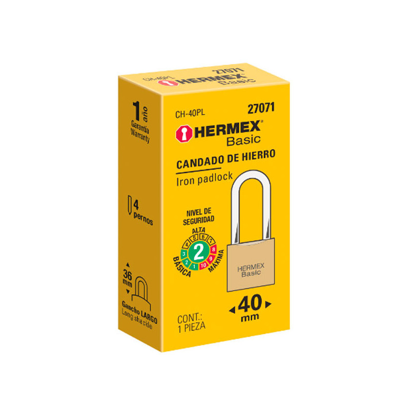 Candado de Hierro 40mm Seguridad 2, 2 llaves tradicional, CH-40P 23518 Hermex Nivel de seguridad: Básico (1, 2, 3) Cuerpo de hierro acabado color latón Gancho corto de acero con acabado cromado Cilindro metálico con 3, 4 y 5 pernos de combinación Mecanismo interno resistente a la corrosión