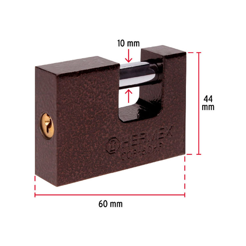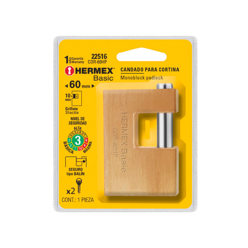 Candados Antipalanca 60mm S5 Hermex 22518 Cuerpo de latón con acabado pulido Seguro de balín que proporciona mayor seguridad Cilindro de latón sólido con 4 pines que brinda resistencia a robos Mecanismo interno resistente a la corrosión Para cortina metálica
