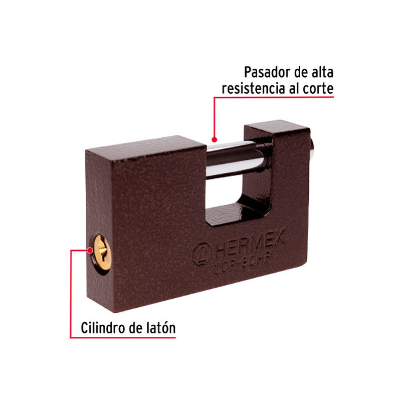 Candados Antipalanca 60mm S5 Hermex 22518 Cuerpo de latón con acabado pulido Seguro de balín que proporciona mayor seguridad Cilindro de latón sólido con 4 pines que brinda resistencia a robos Mecanismo interno resistente a la corrosión Para cortina metálica