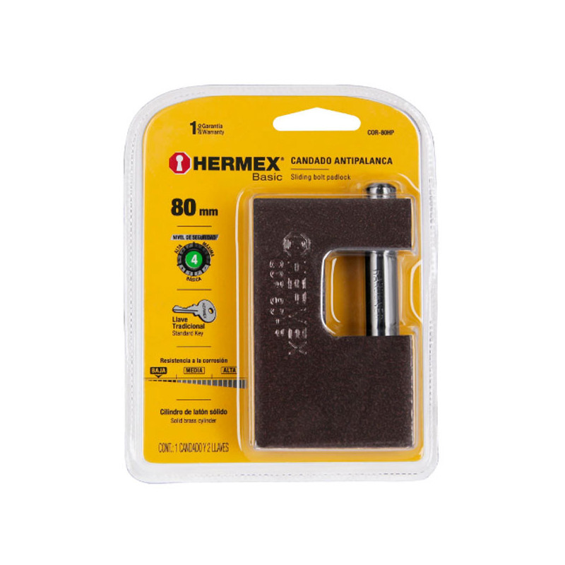Candado Antipalanca 75mm Seguridad 5, seguro tipo perno incluye 2 Llaves tradicional, COR-75ZP 23524 Hermex Niveles de seguridad: Alta (4, 5) Cuerpos de zamac recubierto en ABS que resiste impactos Cilindro de latón sólido con 4 pernos de combinación Llave y componentes de latón para mayor vida útil Mecanismo interno resistente a la corrosión