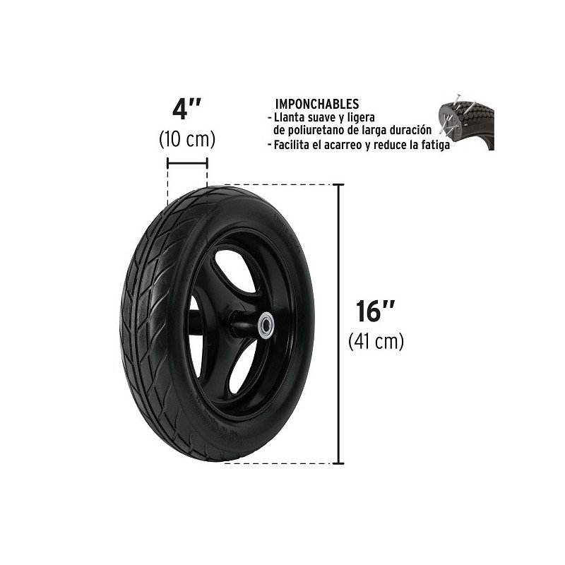 Llanta completa Imponchanble Reforzada 16 x 4", doble rodaje Incluye rin eje y baleros, RN-X 19658 Truper Llanta suave y ligera de larga duración fabricada en poliuretano 100% Brinda mejor amortiguamiento en terrenos irregulares, facilita el acarreo y reduce la fatiga Rin fabricado en acero con acabado en polvo poliéster color negro Eje fabricado en acero...