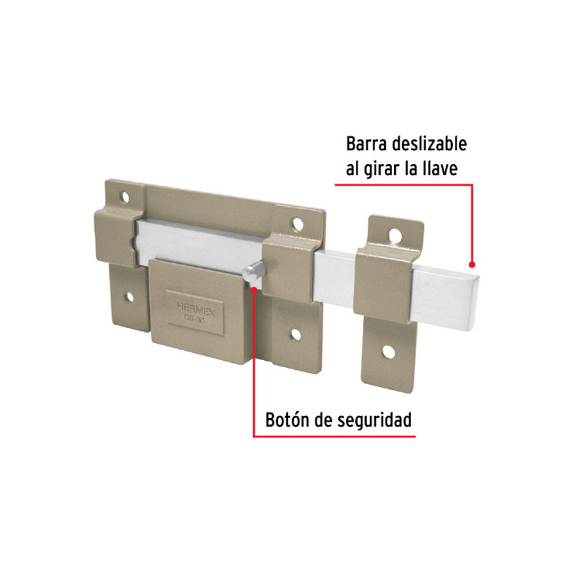 Cerraduras de Doble Barra Doble Cerrojo Hermex 43501 Cilindro de latón sólido para mayor resistencia contra robos Doble cerrojo de acero sólido con mecanismo que se extiende en direcciones opuestas Cerradura de doble barra, corte en escuadra en los extremos para añadir extensiones Para colocarse en cortinas y puertas metálicas