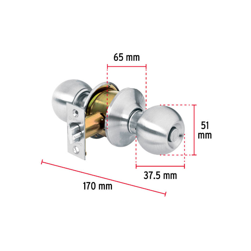 Cerraduras Pomo Oval Cromo Mate Dormitorio Hermex 43452 Cerrojo con llave al exterior y botón de seguridad al interior Mecanismo cilíndrico con cilindro de latón sólido Perilla y escudo de acero inoxidable, acabado cromo mate Para colocación en puertas con espesor de 1-1/4" a 1-3/4" (32 a 45 mm)