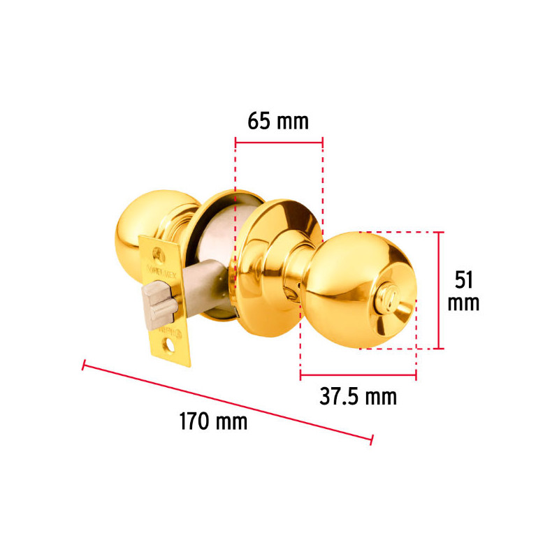 Cerraduras Pomo Oval Dorado brillante Dormitorio Hermex 43458 Cerrojo con llave al exterior y botón de seguridad al interior Mecanismo cilíndrico con cilindro de latón sólido Perilla y escudo de latón, acabado latón brillante Para colocación en puertas con espesor de 1-1/4" a 1-3/4" (32 a 45 mm)