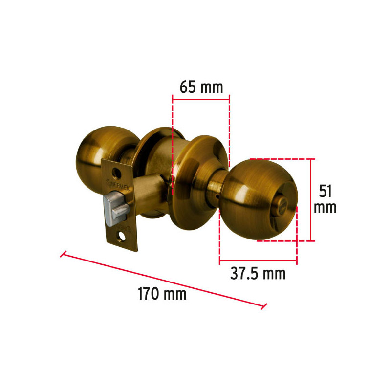 Cerraduras Pomo Dorado brillante Dormitorio Hermex 43473 Cerrojo con llave al exterior y botón de seguridad al interior Mecanismo cilíndrico con cilindro de latón sólido Perilla y escudo de latón, acabado latón brillante Para colocación en puertas con espesor de 1-1/4" a 1-3/4" (32 a 45 mm)