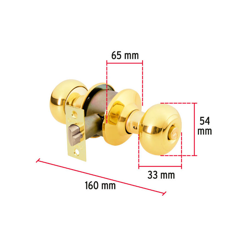 Cerraduras Pomo Oval Dorado brillante Entrada Hermex 43457 Cerrojo con llave al exterior, sin botón al interior Mecanismo cilíndrico con cilindro de laton sólido Perilla y escudo de latón, acabado latón brillante Para colocación en puertas con espesor de 1-1/4" a 1-3/4" (32 a 45 mm)