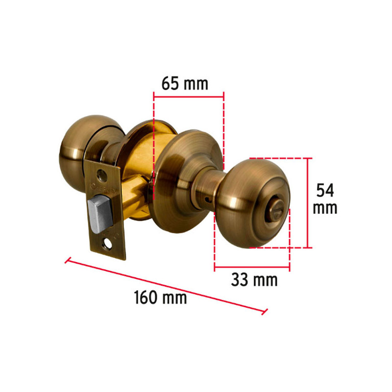 Cerraduras Pomo Oval Laton Antiguo Dormitorio Hermex 43455 Cerrojo con llave al exterior y botón de seguridad al interior Mecanismo cilíndrico con cilindro de latón sólido Perilla de acero inoxidable y escudo de latón, acabado, latón antiguo Para colocación en puertas con espesor de 1-1/4" a 1-3/4" (32 a 45 mm)