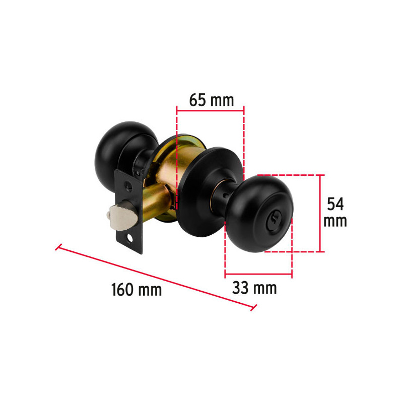 Cerraduras Pomo Negro Dormitorio Hermex 43910 Cerrojo con llave al exterior y botón de seguridad al interior Mecanismo cilíndrico con cilindro de latón sólido Perilla y escudo de acero inoxidable, acabado negro Para colocación en puertas con espesor de 1-1/4" a 1-3/4" (32 a 45 mm)