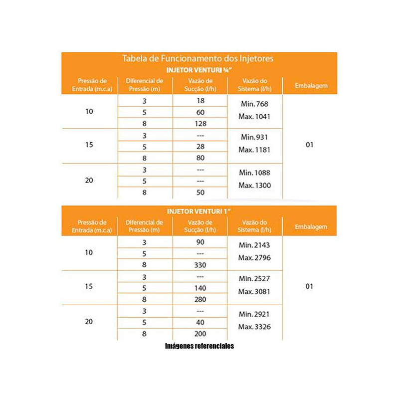 El inyector venturi sin partes móviles, y muchas veces sin sistema de bomba suplementario, es la opción más rentable ya que ofrece las ventajas de un sistema no mecánico de fácil mantenimiento. Diseñado para la transferencia en vacío de sustancias químicas en el riego, provee un fertirriego seguro, proporcionando una mezcla precisa y una distribución uniforme de productos dentro del chorro de agua.