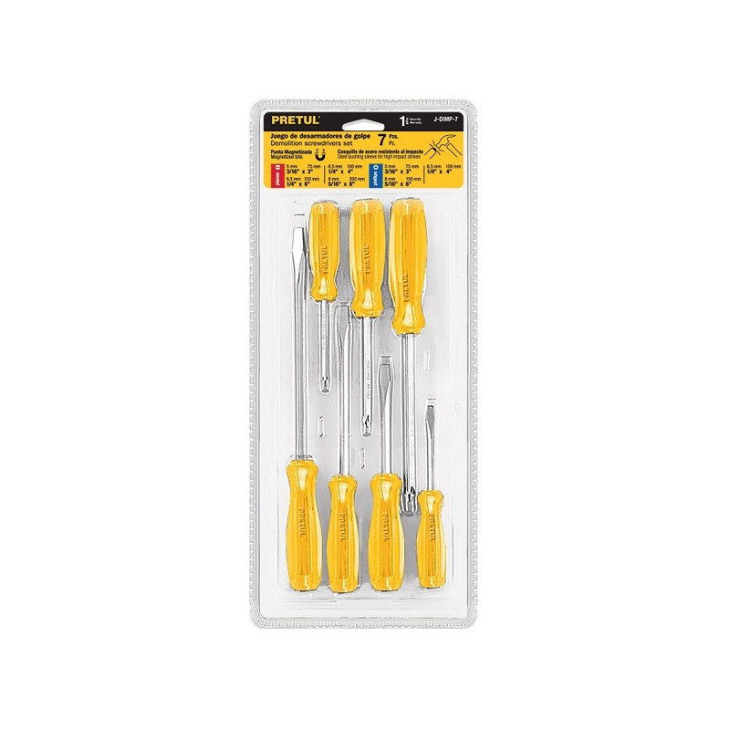 Juego Desarmadores de Caja 7 Piezas Mango de PVC, DJ-7P 21420 Pretul Barra redonda fabricada de acero al cromo vanadio Mango fabricado en PVC Doble espiga extra profunda Hexágono en la barra para maximizar el torque con llave Mecánica, carpintería, industria, hogar, etcétera