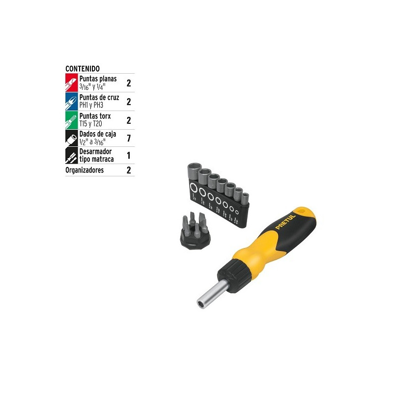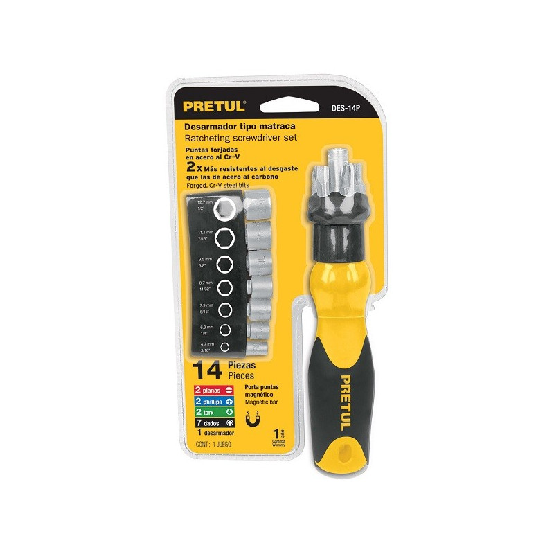 Juego Desarmadores Multipunta 6 Puntas y 7 dados Tipo Ratchet, PPMagnetico Acero al Cromo Vanadio, DES-14P 22974 Pretul