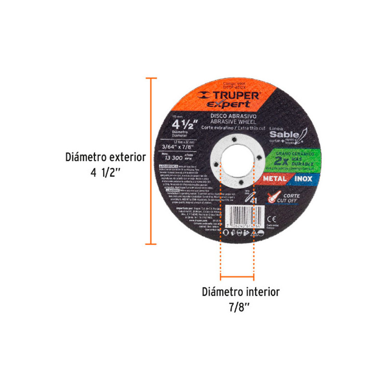 Discos de Corte Metal 4-1/2" x1.2mm OAluminio Inox D7/8 T41, Truper 11901