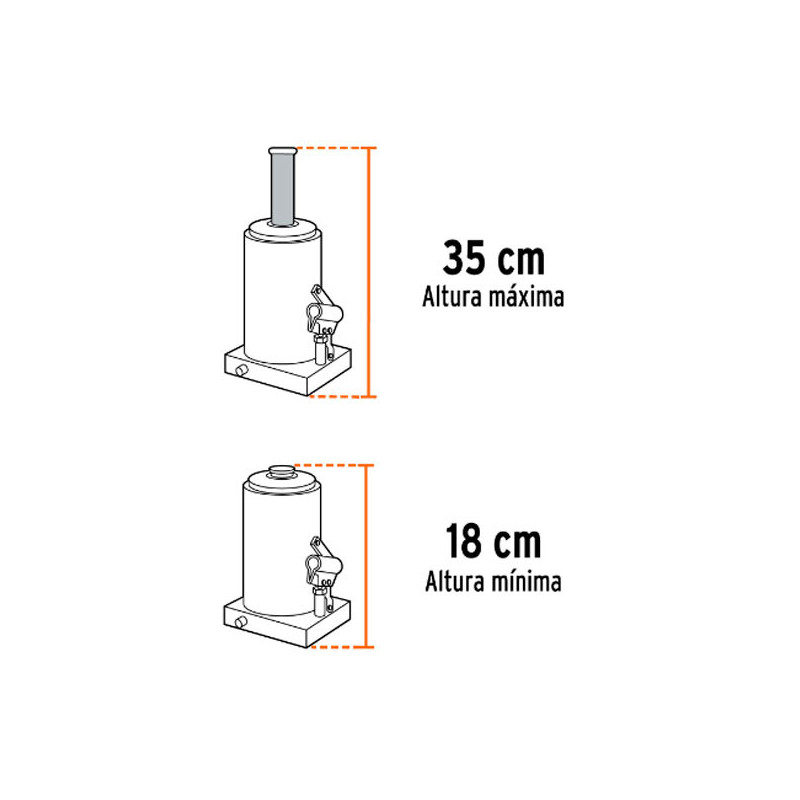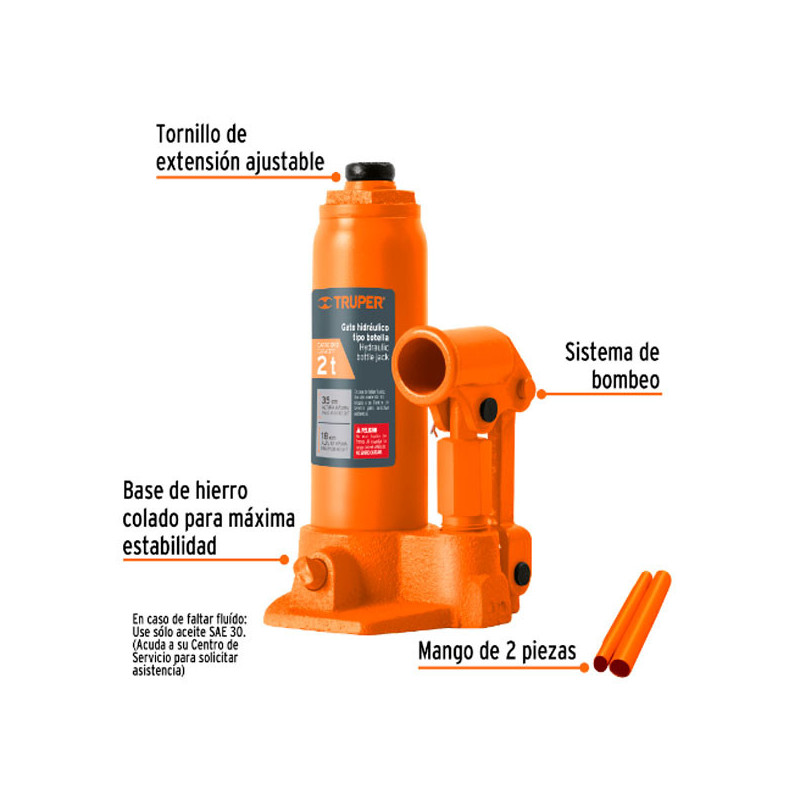 Gata de Botella 32 Toneladas, Con Tornillo de Extension, Altura Max 427 mm, GAT-32 14819 Truper Puede utilizarse para empujar elementos de forma horizontal, cuidando que el sistema de bombeo quede hacia abajo Cabeza maquinada que reduce el deslizamiento Práctica asa para transportarlo Válvula de liberación Base de hierro nodular
