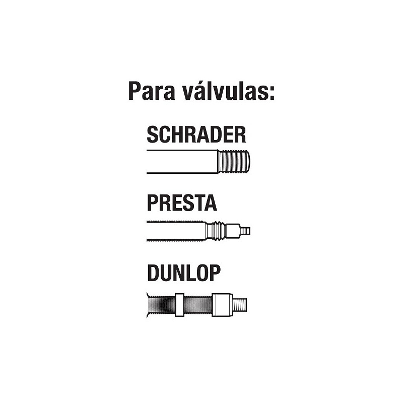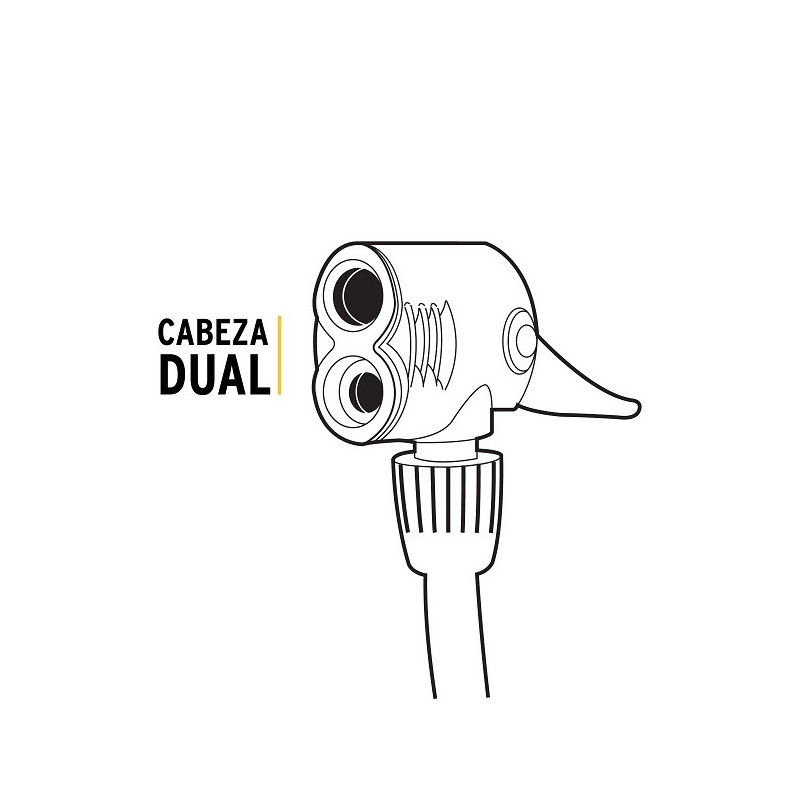 • Cabeza dual que permite el uso de válvulas europea (Presta), americana (Schrader) y Dunlop