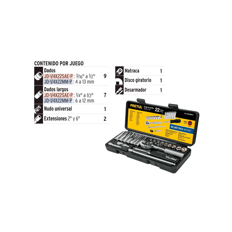 Juego de dados 22 Piezas Milimetrico con Estuche de Plastico, Encastre 1/4", JD-1/4X22MM-P 23980 Pretul