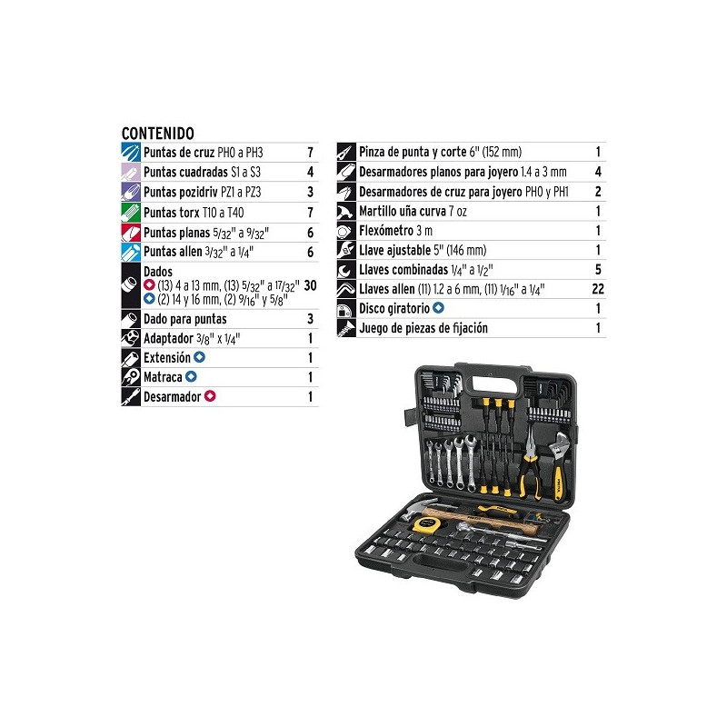 • 30 Dados: (13) 4 a 13 mm, (13) 5/32" a 17/32, (2) 14 y 16 mm, (2) 9/16" y 5/8