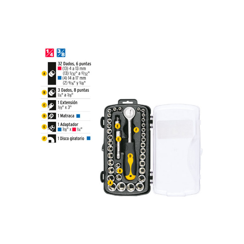 • 32 Dados 6 puntas: (13) 4 a 13 mm, (13) 5/32" a 17/32", (4) 14 a 17 mm, (2) 9/16" y 5/8"