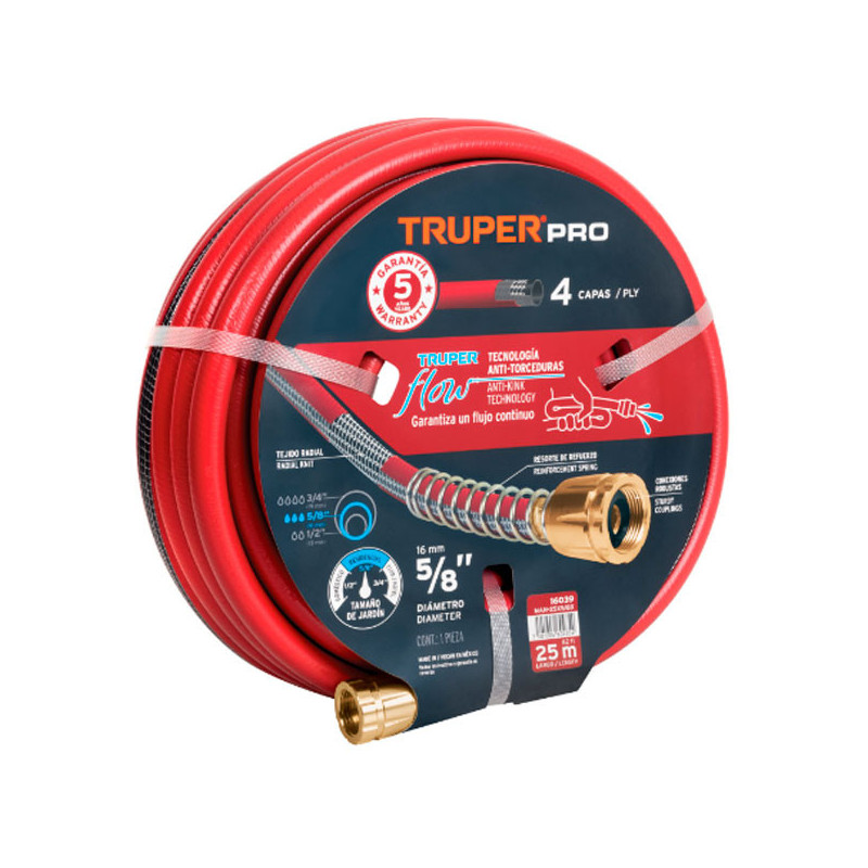 Mangueras 5/8" x30m 4capas SReforzada ConexionesMetalicas Truper 16040 Manguera con refuerzo de tejido radial resistente a la alta presión Conexiones metálicas robustas de máxima durabilidad con resorte que protege la manguera y evita deformaciones Tecnología anti-torceduras, garantiza un flujo continuo Uso residencial