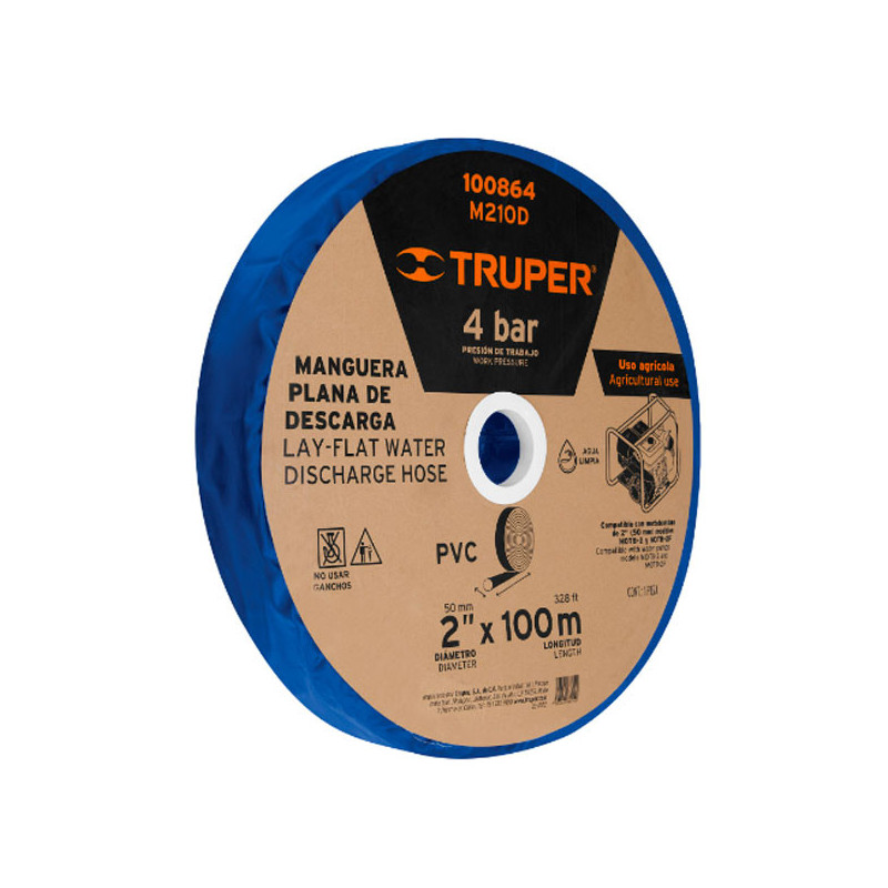 Rollos Mangueras Plana 2" x50m Descarga para motobombas Truper 100862 Diseño plano para mayor flexibilidad y fácil almacenamiento Para la conducción de grandes flujos y descarga de agua limpia en aplicaciones industriales, agrícolas, de riego y construcción de servicio ligero Fabricada con PVC de alta resistencia con refuerzo de poliéster, resistente a...