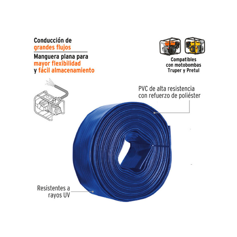 Rollos Mangueras Plana 3" x50m Descarga para motobombas Truper 100865 Diseño plano para mayor flexibilidad y fácil almacenamiento Para la conducción de grandes flujos y descarga de agua limpia en aplicaciones industriales, agrícolas, de riego y construcción de servicio ligero Fabricada con PVC de alta resistencia con refuerzo de poliéster, resistente a...