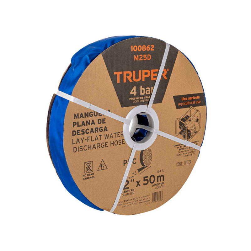 Rollos Mangueras Plana 2" x100m Descarga para motobombas Truper 100864 Diseño plano para mayor flexibilidad y fácil almacenamiento Para la conducción de grandes flujos y descarga de agua limpia en aplicaciones industriales, agrícolas, de riego y construcción de servicio ligero Fabricada con PVC de alta resistencia con refuerzo de poliéster, resistente a...