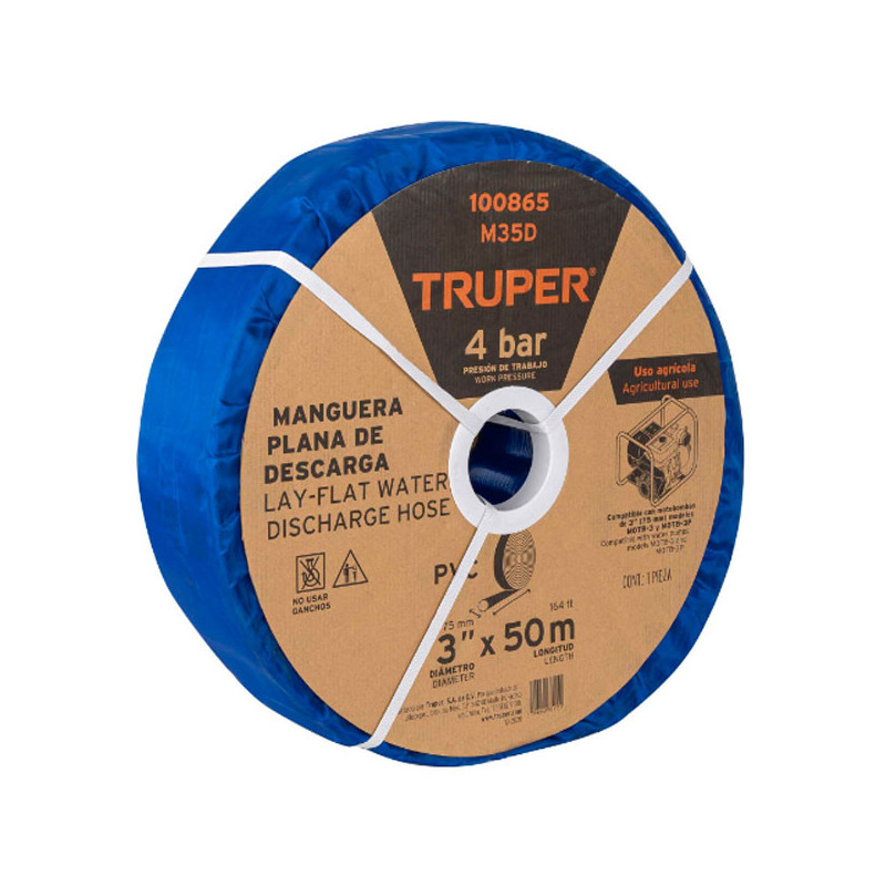 Rollos Mangueras Plana 3" x100m Descarga para motobombas Truper 100866 Diseño plano para mayor flexibilidad y fácil almacenamiento Para la conducción de grandes flujos y descarga de agua limpia en aplicaciones industriales, agrícolas, de riego y construcción de servicio ligero Fabricada con PVC de alta resistencia con refuerzo de poliéster, resistente a...