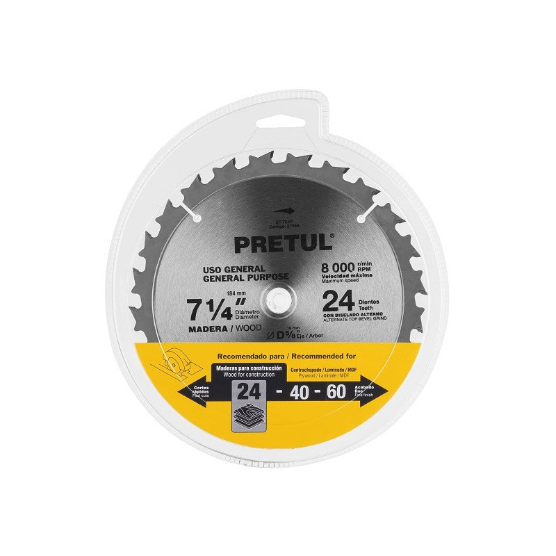 Discos sierras 7-1/4" 60Dientes C5/8", para madera, Pretul 27059 Dientes de carburo de tungsteno con soldadura de alta frecuencia Ranuras de expansión que reducen la vibración, el sonido y la generación de calor Biselado alterno: El disco alterna un diente hacia la derecha y el otro a la izquierda