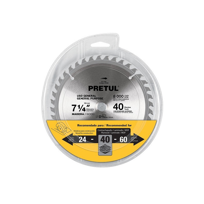 Discos sierras 7-1/4" 60Dientes C5/8", para madera, Pretul 27059 Dientes de carburo de tungsteno con soldadura de alta frecuencia Ranuras de expansión que reducen la vibración, el sonido y la generación de calor Biselado alterno: El disco alterna un diente hacia la derecha y el otro a la izquierda