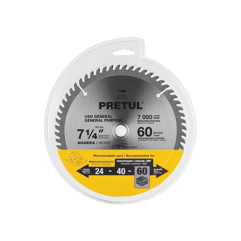 Discos sierras 7-1/4" 40Dientes C5/8", para madera, Pretul 27056 Dientes de carburo de tungsteno con soldadura de alta frecuencia Ranuras de expansión que reducen la vibración, el sonido y la generación de calor Biselado alterno: El disco alterna un diente hacia la derecha y el otro a la izquierda