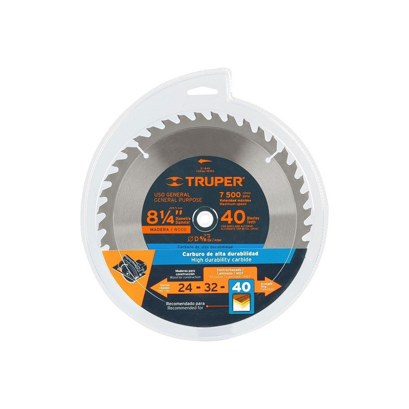 Discos Sierras 8-1/4" 40Dientes C5/8" para madera, Truper 18303