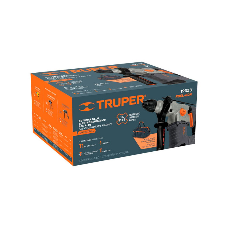 RotoMartillos SDS Plus 5 Joules Industrial 1500W cMaleta, Truper 19260 Sistema de inserción rápida SDS Plus Doble selector de funciones de rotomartillo, taladro, cincelado y cincelado más ángulo ajustable Mango ergonómico antiderrapante brinda mayor control al operador Mango auxiliar 360° para mayor comodidad Modo libre, puede girar el cincel en cualquier...