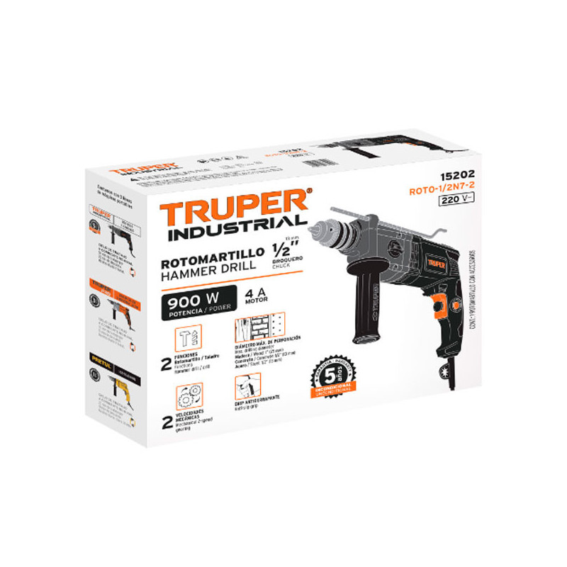 Taladro Percutor 1/2" 600W 3000RPM 44800GPM Velocidad Reversible, ROTO-1/2A7-2 15346 Truper Motor de 600 W, balero de bolas que prolonga la vida útil de la máquina Selector de función taladro o rotomartillo, con velocidad variable reversible Mango auxiliar de plástico con giro de 360° para mayor comodidad y mayor control en el perforado Para perforaciones...