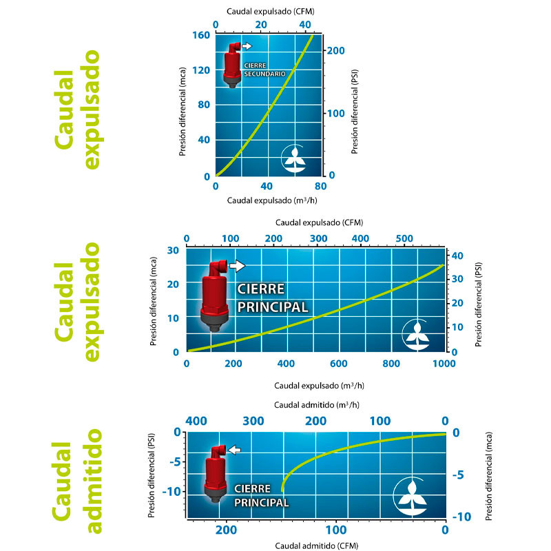 Evacuará al menos 2000 m³/h de aire sin que ello provoque el cierre de la válvula en ausencia de agua.